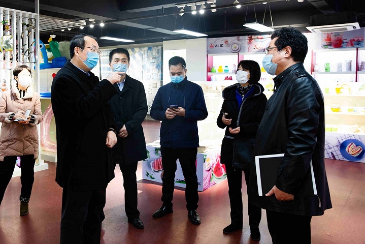 在公司門口,周省長一行認(rèn)真接受了體溫測(cè)試和手部消毒,詢問了公司具體的防控措施。在公司展廳和設(shè)計(jì)研發(fā)中心,周省長詳細(xì)詢問了公司進(jìn)出口市場(chǎng)、產(chǎn)品開發(fā)、貨源分布等情況。