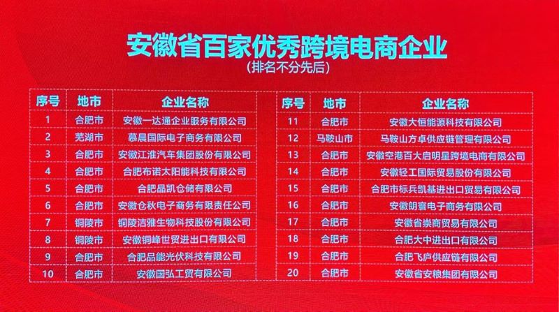 公司榮獲“安徽省跨境電商企業20強”,公司及合肥大中均被列入“安徽省百家優秀跨境電商企業名錄”。