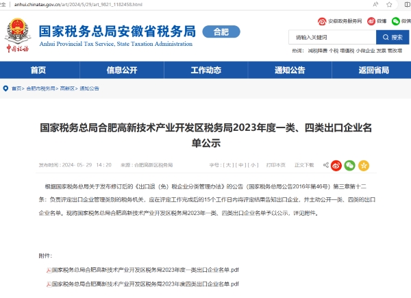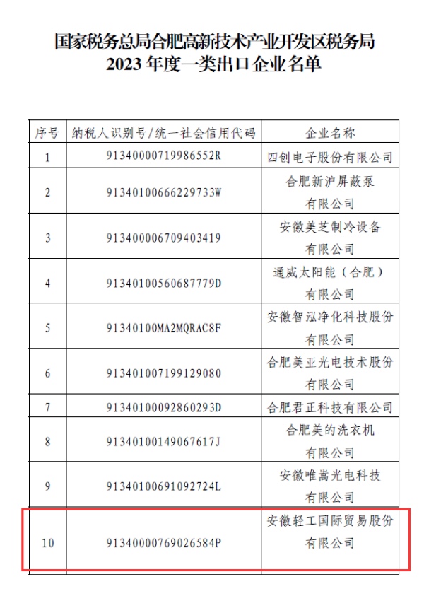 近日,國家稅務(wù)總局合肥高新技術(shù)產(chǎn)業(yè)開發(fā)區(qū)稅務(wù)局正式公布了2023年度一類、四類出口企業(yè)名單,輕工國際位列出口退稅“一類企業(yè)”名錄中,成為高新區(qū)唯一一家獲此殊榮的外貿(mào)企業(yè)。