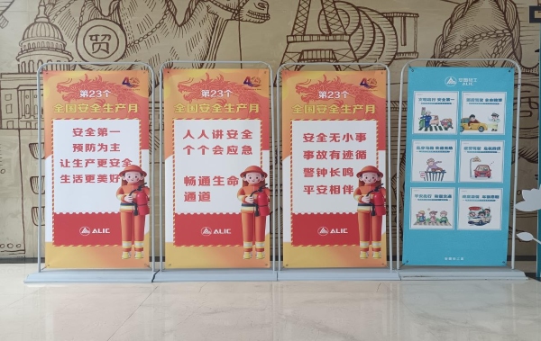 (在人流密集的大廳通道,陳列安全主題宣傳展板)