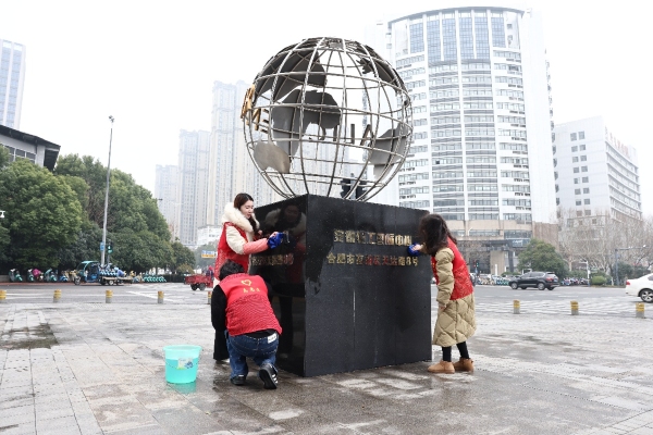 3月的合肥,春寒料峭,但志愿者們熱情高漲,爭相領取清潔工具,踴躍地投入到火熱的勞動中去。針對不同的清潔區域,團員們主動開展分工協作,一部分團員對公司的主題雕塑進行除塵除垢;另一部分團員組建“玻璃清潔突擊隊”,運用玻璃刮、伸縮桿等工具對外墻玻璃開展精細化擦拭?。志愿者們在勞動中互幫互助,現場呈現“高空與地面聯動、水桶與抹布共舞”的熱烈場景?。