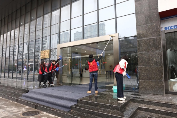 面對雕塑上沉積的部分頑固污漬,團員們耐心地深入縫隙,對細節之處對進行反復擦拭;針對玻璃幕墻的清潔,志愿者們定制“三步清潔法”——沖洗、刮擦、拋光,使陽光下的建筑煥發通透質感?。經過一段時間的奮戰,原先布滿灰塵的玻璃幕墻變得一塵不染、光潔如新,公司標志性景觀重現熠熠光彩。